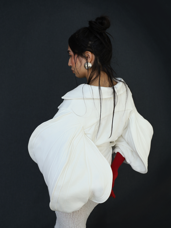 Featuring an oversized lapel, asymmetrical zipper closure, and a wide belt to accentuate the waist, this piece is both protective and empowering — a wearable sculpture designed to command presence.
